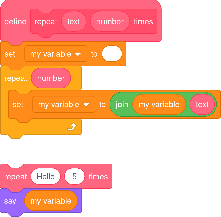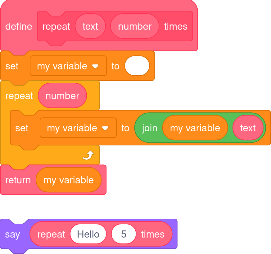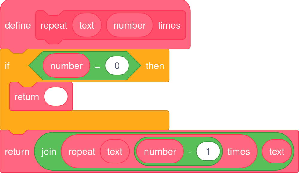 Recursion is also supported. This can be especially hard to grasp, but basically, blocks can run themselves. If you can take a large problem and continuously break it down into smaller problems until you reach a known "base case", many algorithms can be written very elegantly.