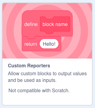 02Engine now supports custom reporters which lets you use any custom block in your project as a reporter, like the addition block built into Scratch. This is a pretty standard feature in text-based programming languages, but it can be hard to understand initially.